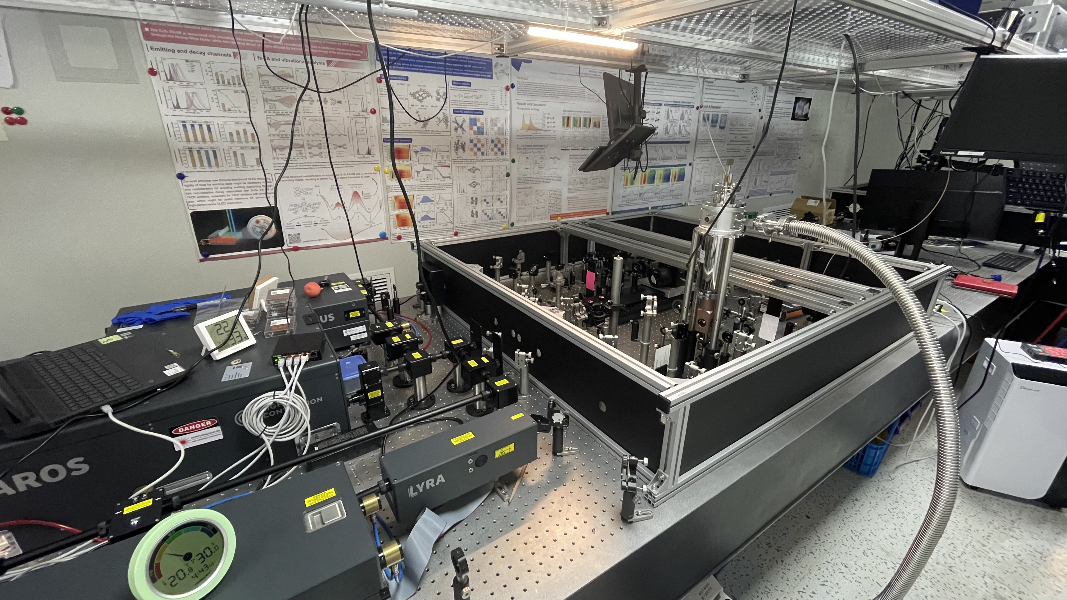 飞秒光谱系统1:Yb:KGW飞秒激光,1030 nm,0.4 mJ@37 kHz,250 fs;光参量放大器(2套,sub-30 fs);飞秒泵浦-探测光谱(2套,自建);低温光学恒温器。